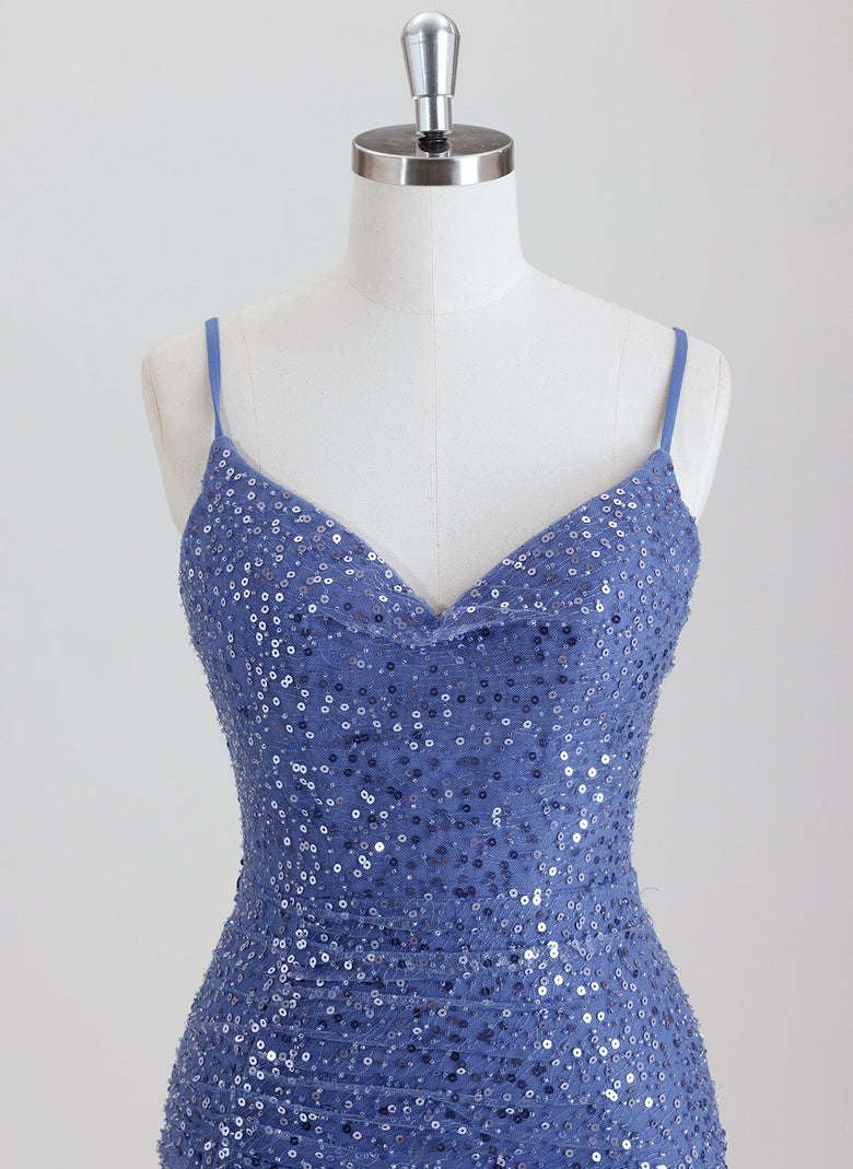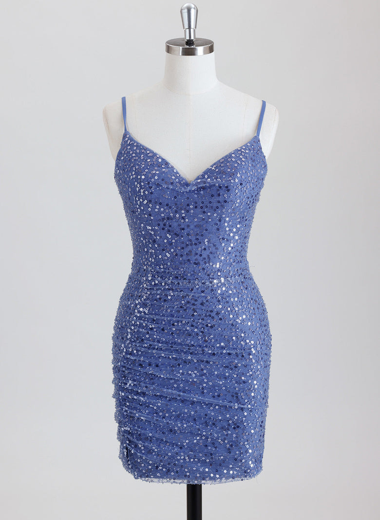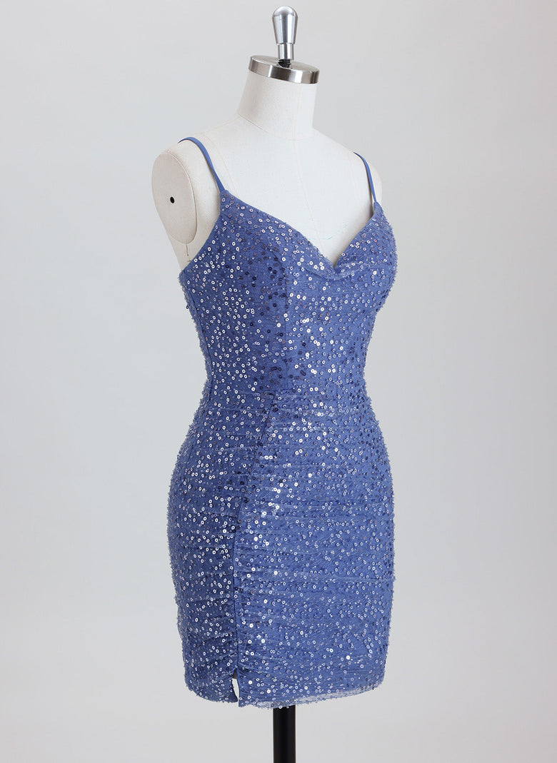 This sheath-style homecoming dress features a flattering column silhouette and a short hemline, designed to highlight your figure with elegance. The V-neckline adds a touch of sophistication, while the shimmering sequins throughout create a dazzling effect perfect for special occasions. Crafted to combine style and comfort, this dress ensures you stand out with a refined sparkle at your event.