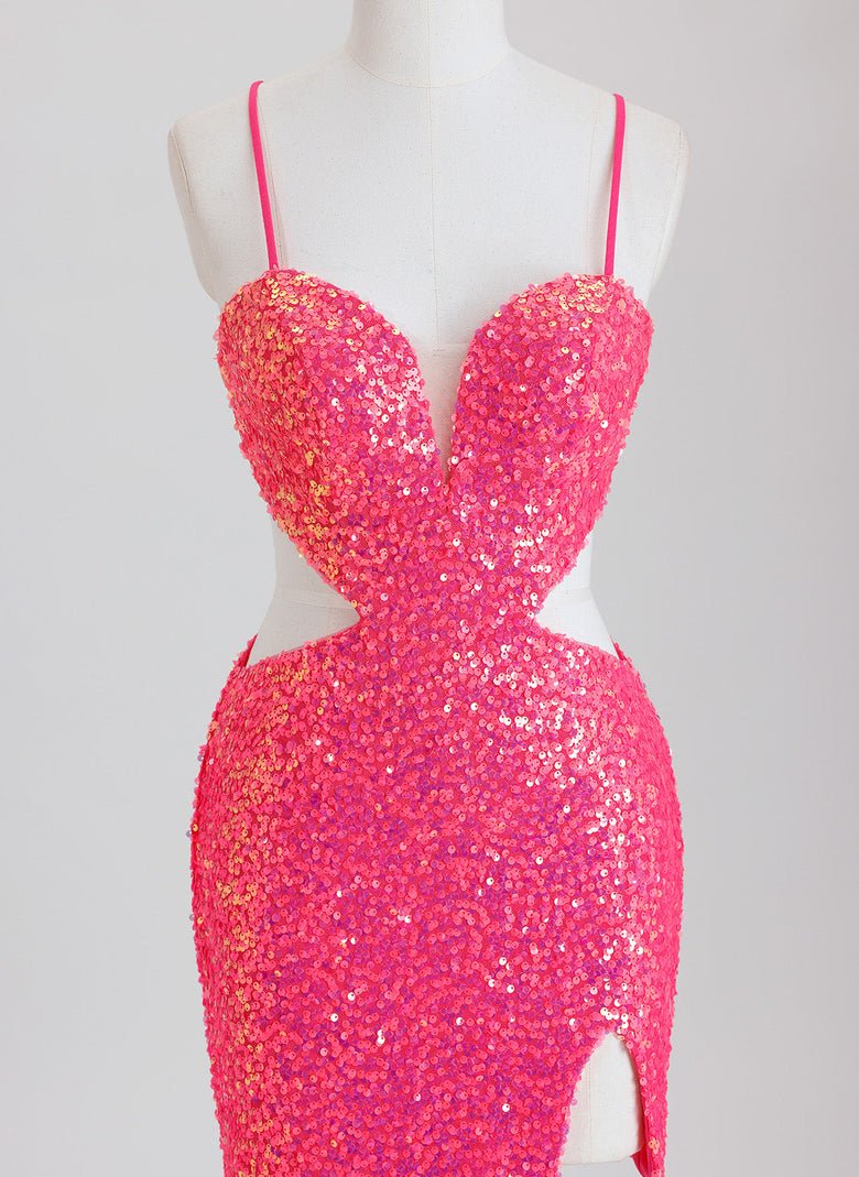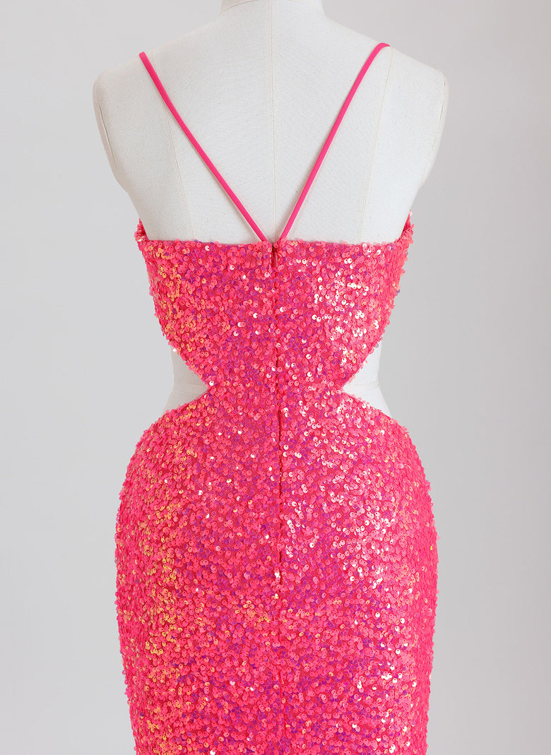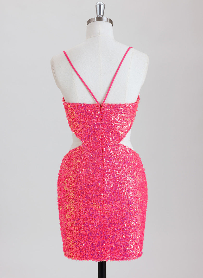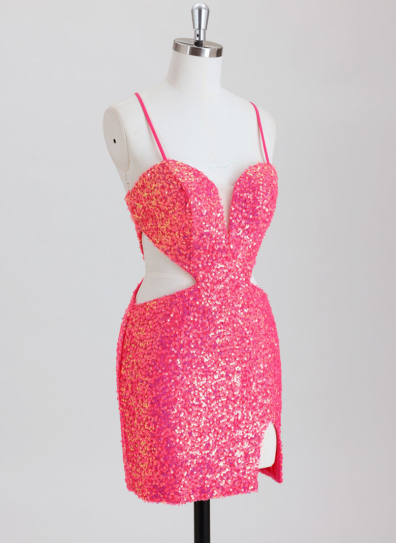 This sheath-style short homecoming dress features a sleek column silhouette adorned with shimmering sequins for a dazzling effect. The side cut-out detail adds a modern, edgy touch while maintaining elegance, making it perfect for standing out at any event. Crafted to flatter your figure, this dress combines sophistication with a hint of boldness for a memorable look.