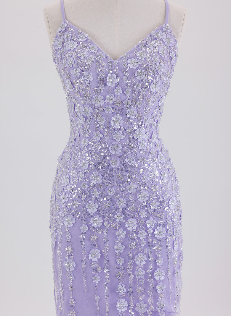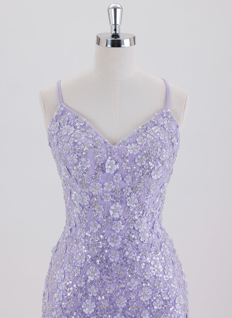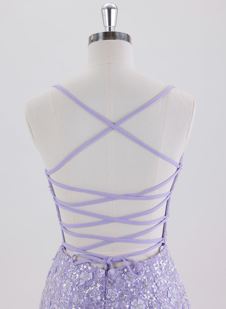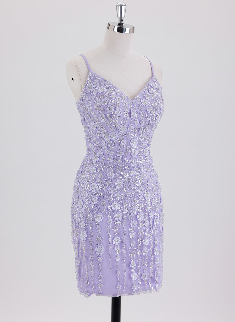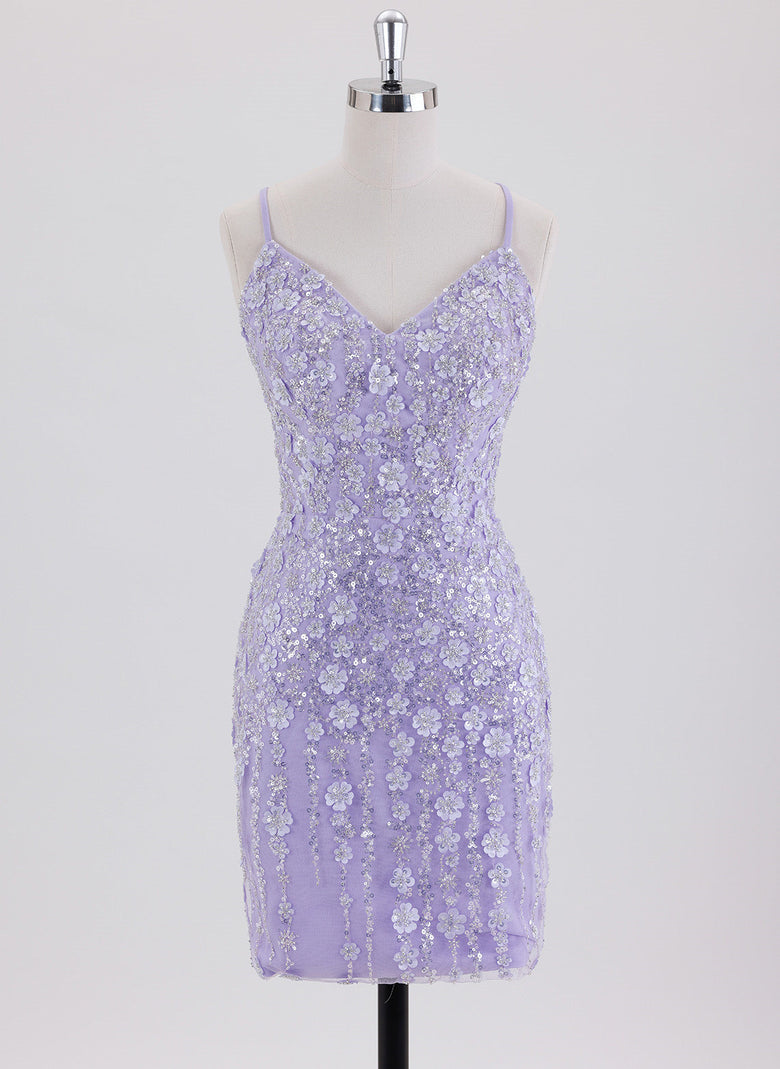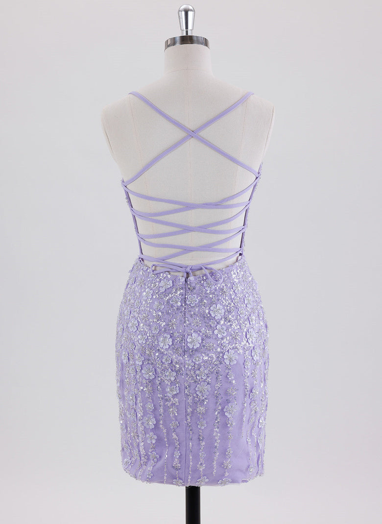 This short sheath dress features delicate spaghetti straps and intricate lace detailing, enhanced with shimmering sequins for a refined sparkle. Its column silhouette flatters the figure, while the crossed straps at the back add an elegant, modern touch. Ideal for homecoming or special occasions, this dress combines classic design with subtle glamour for a confident, polished look.