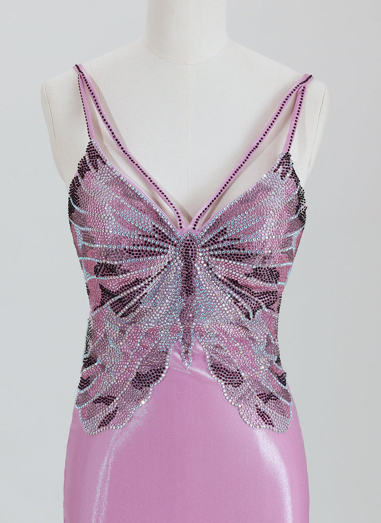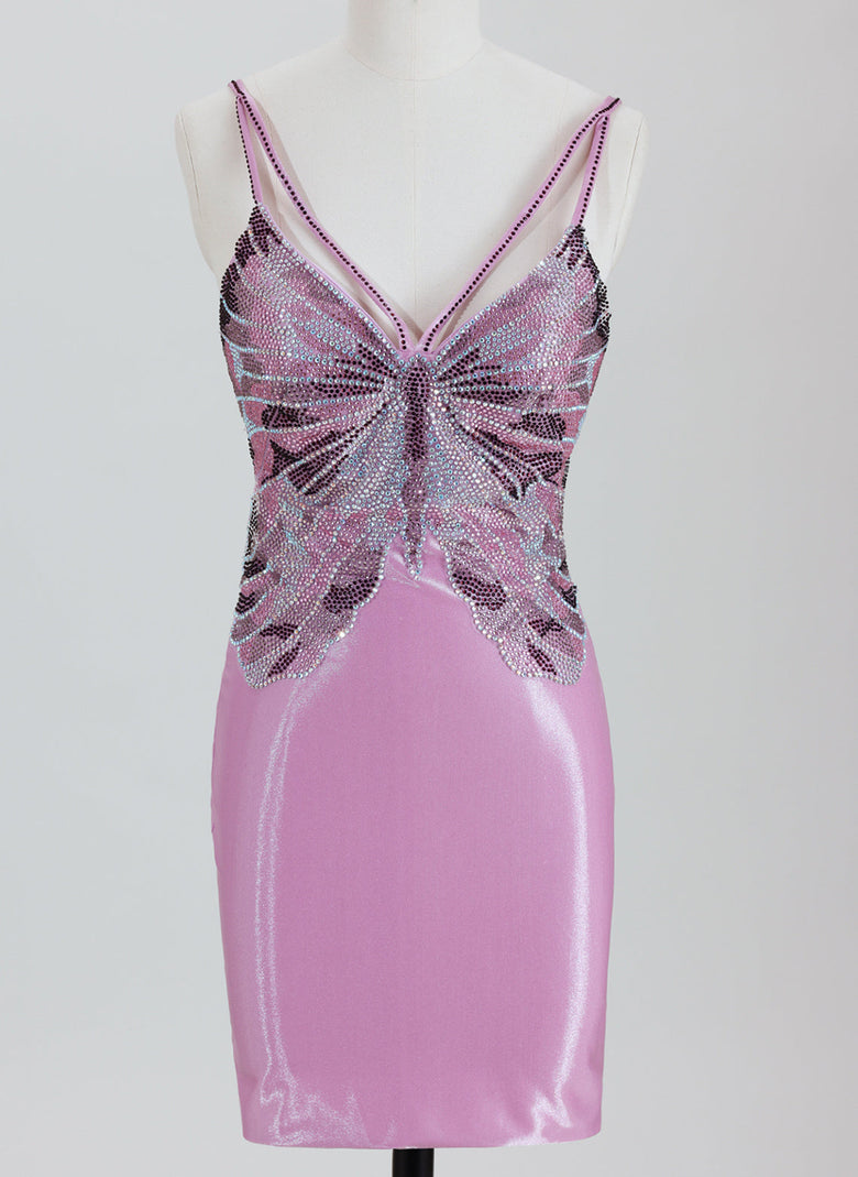 This elegant short satin homecoming dress features a sleek sheath silhouette with delicate spaghetti straps, offering a flattering fit. The standout rhinestone butterfly pattern adds a touch of sparkle and sophistication, while the crossed open back design enhances its modern appeal. Perfect for making a graceful statement at any special occasion.