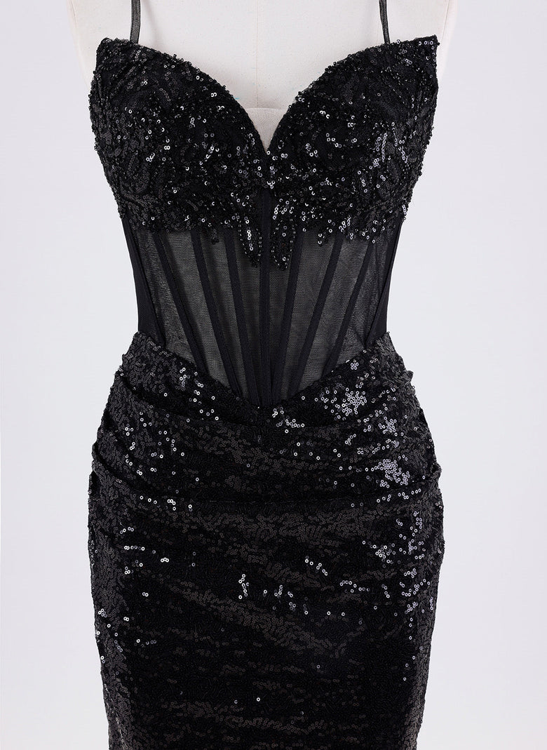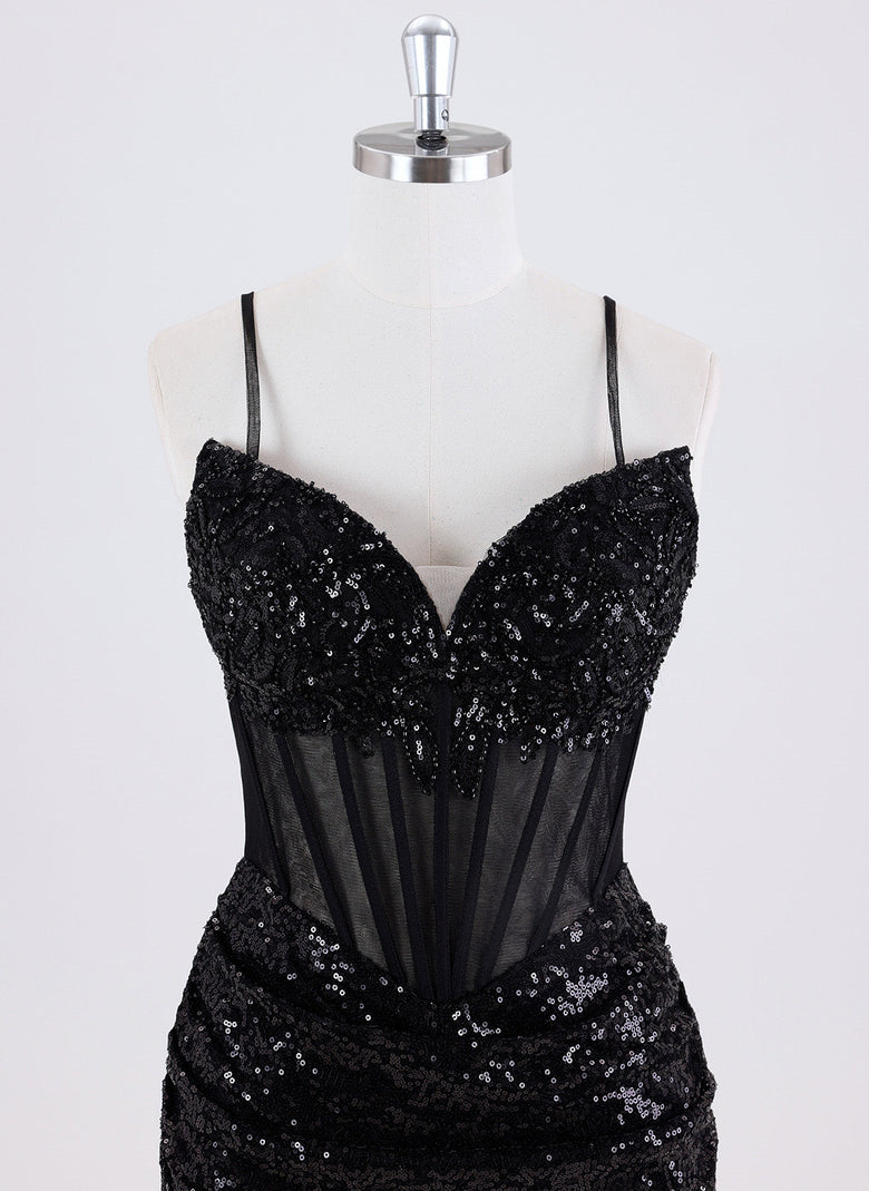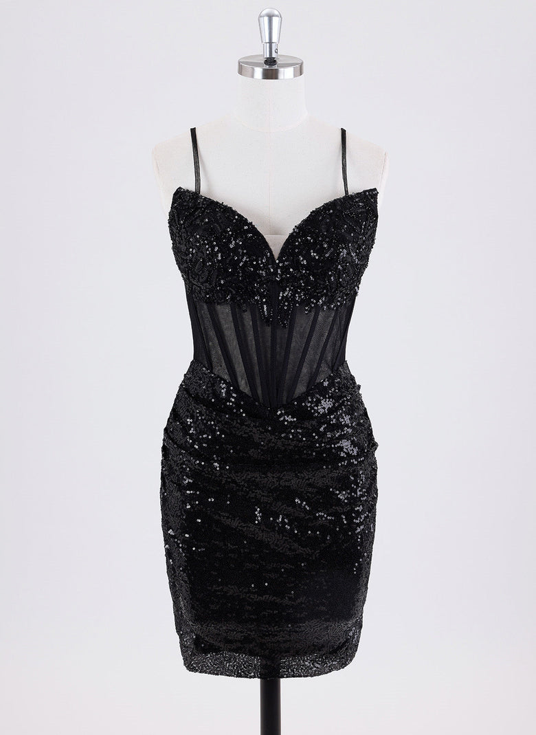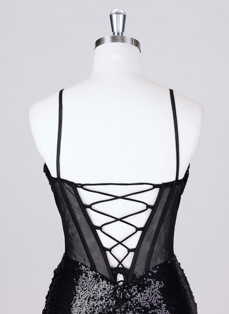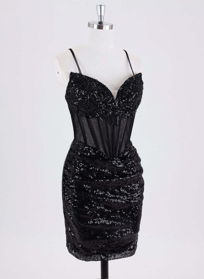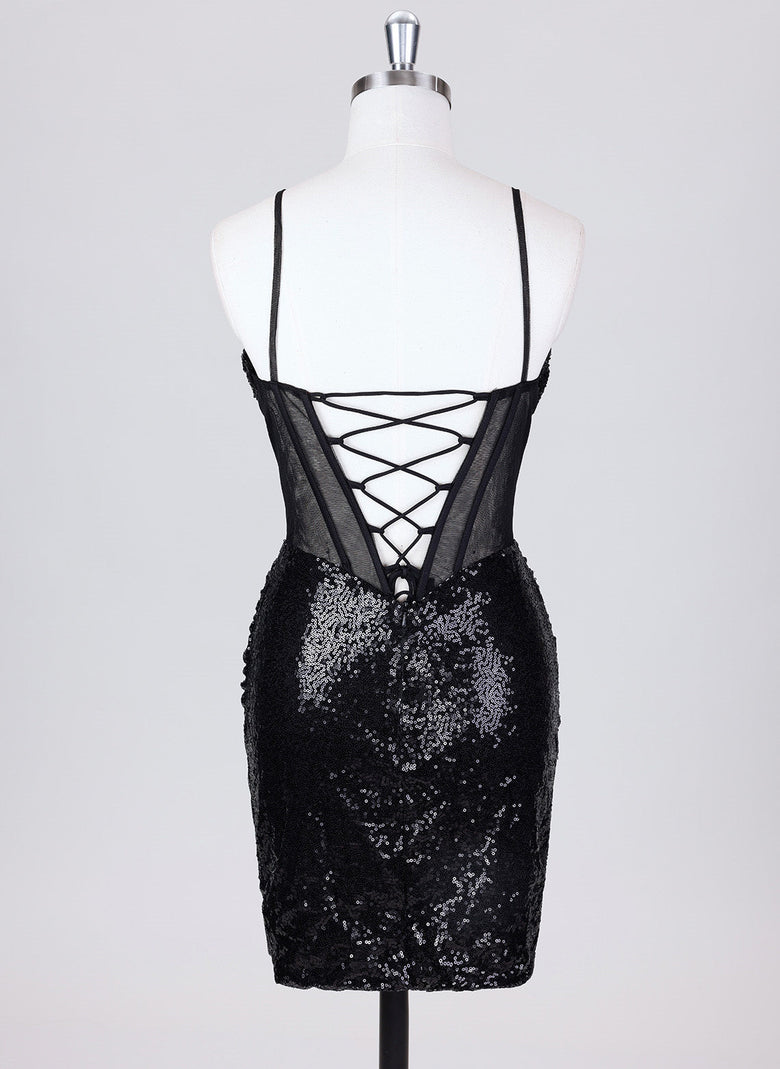 This short sheath dress features delicate spaghetti straps and a sleek column silhouette, crafted from shimmering sequin fabric for a standout look. Its crossed back design adds a touch of allure, while the flattering V-neckline enhances elegance. Perfect for homecoming, this dress combines sophistication with a hint of sexy charm.