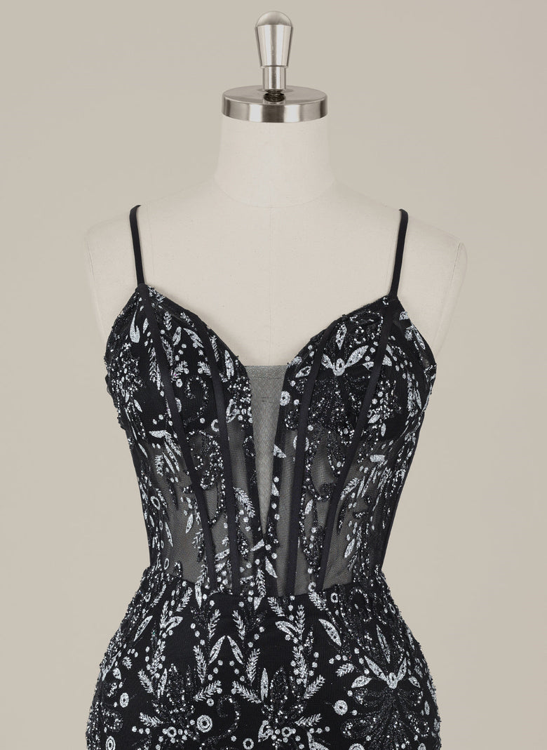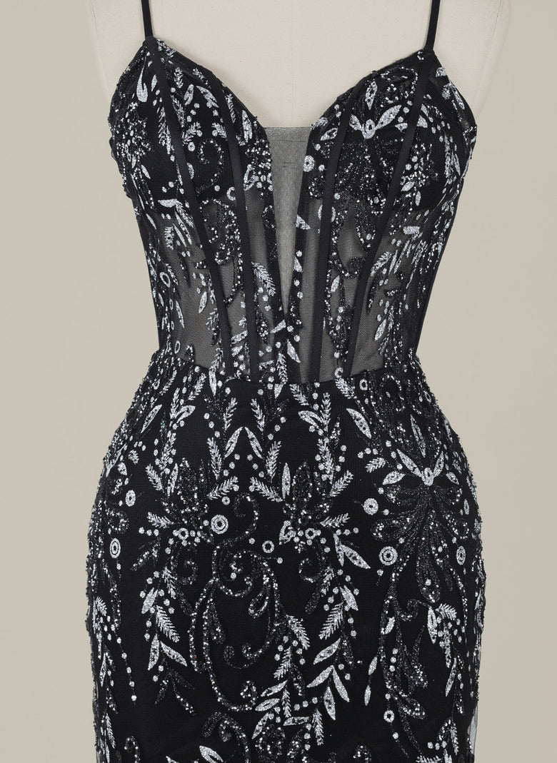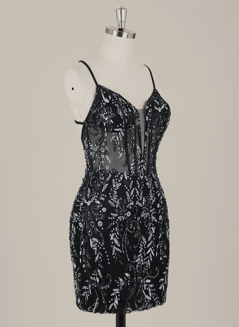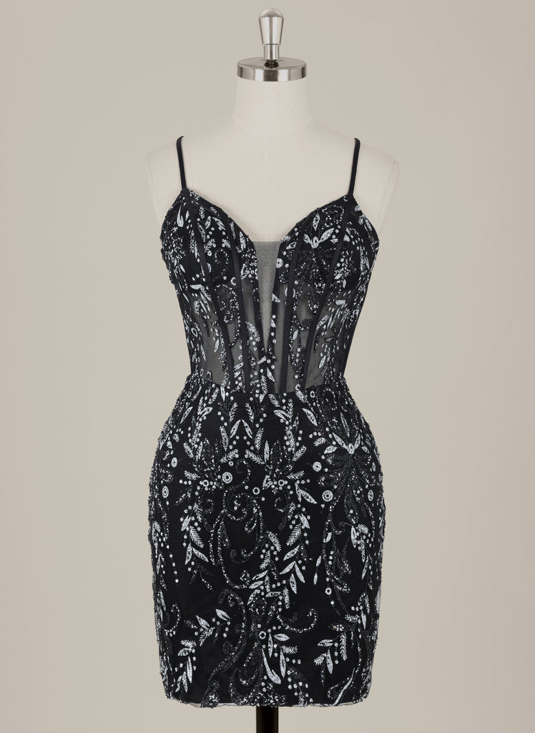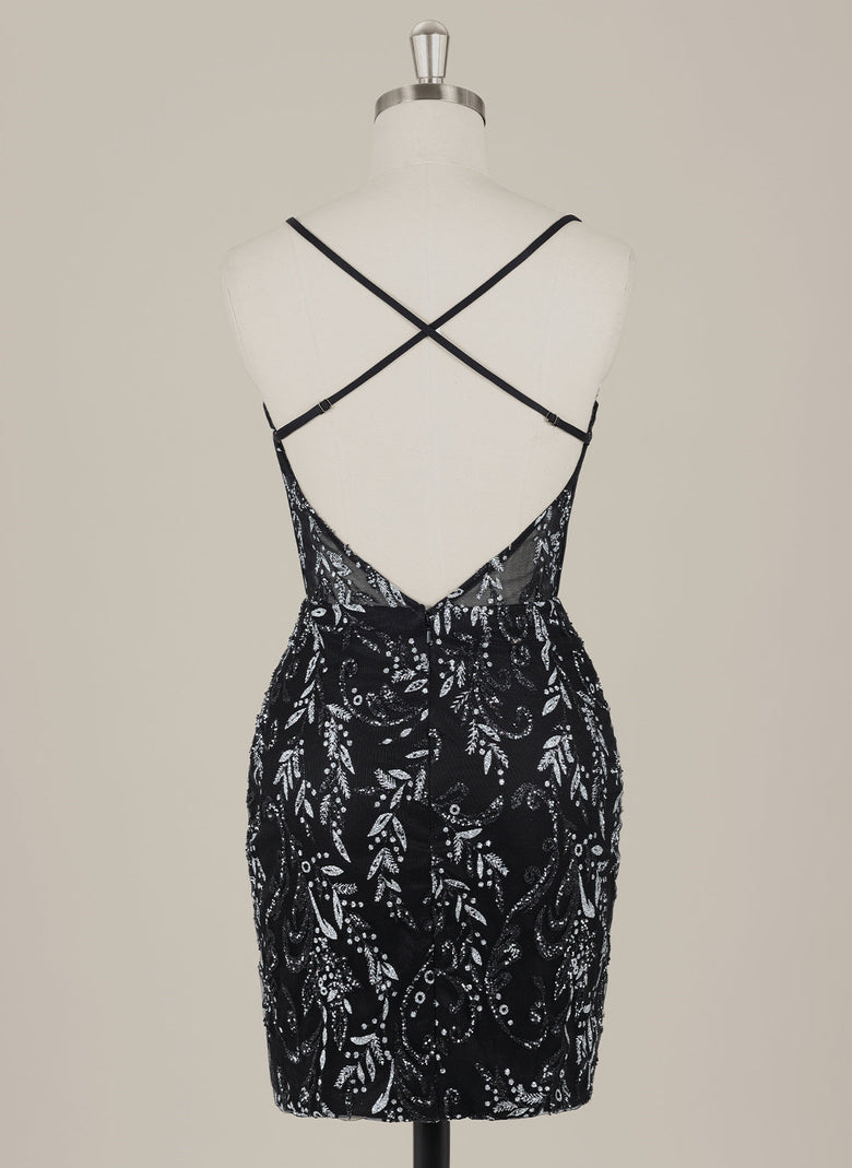 This short sheath dress features delicate spaghetti straps and a sleek column silhouette, enhanced by shimmering sequins for a radiant look. The crossed straps add a stylish detail, ensuring both elegance and support. Perfect for homecoming, this dress combines comfort with eye-catching sparkle to make a memorable impression.