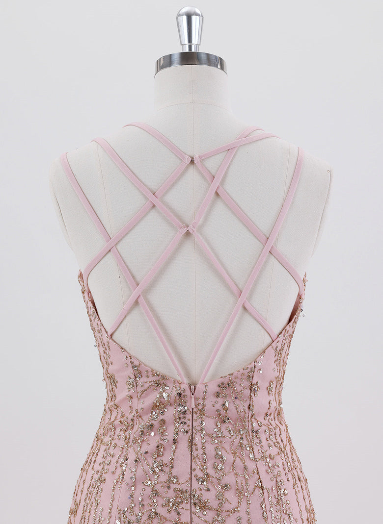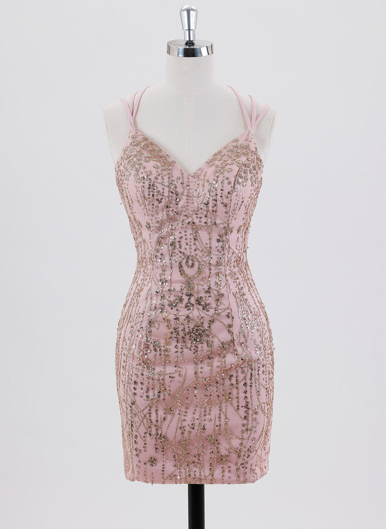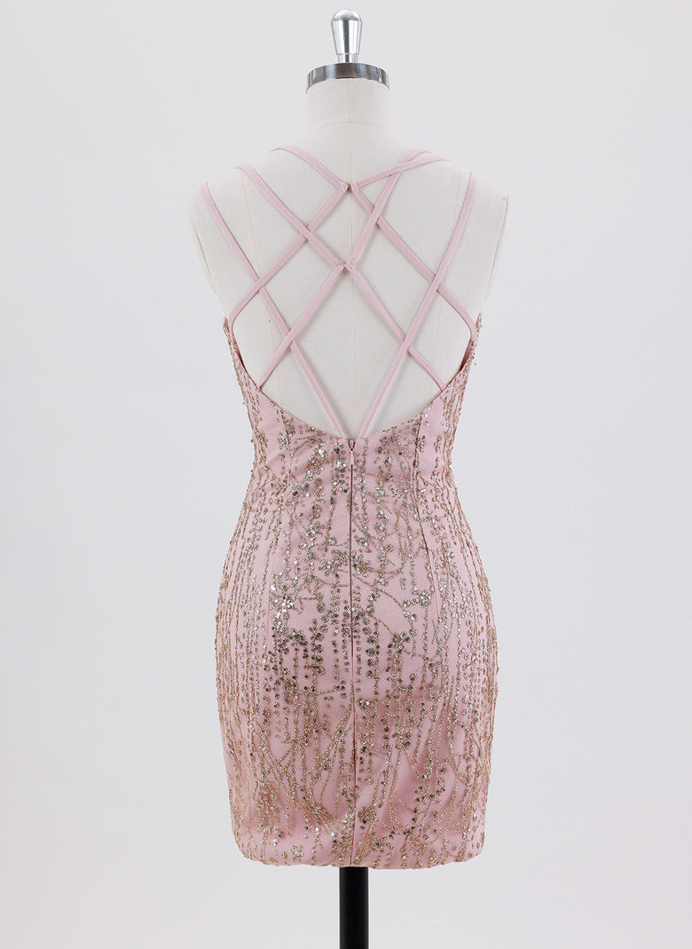 This short sheath dress features delicate spaghetti straps and a shimmering sequin finish, perfect for homecoming events. Its column silhouette flatters the figure, while the crossed open back adds an elegant, modern touch. Ideal for those seeking a sophisticated yet eye-catching look.