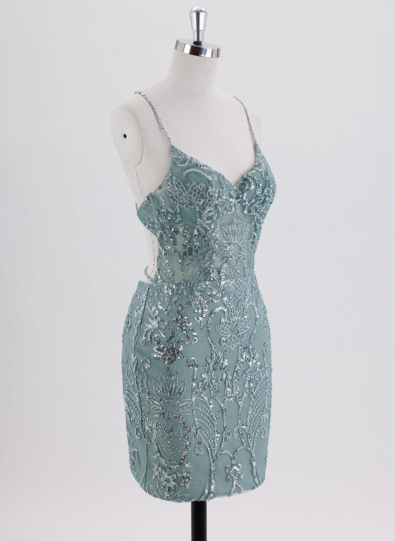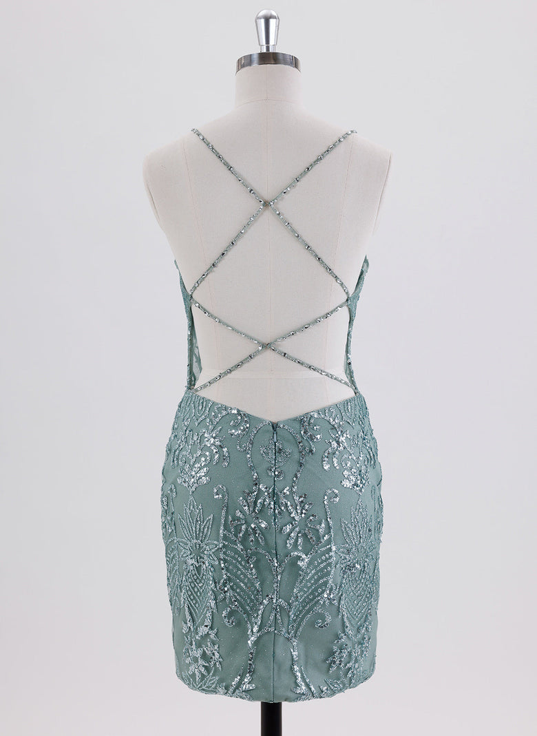 This short sheath dress features delicate spaghetti straps and a sleek column silhouette, elegantly adorned with shimmering sequins. Designed for homecoming, it offers a flattering fit that highlights your figure while providing comfort and style. Perfect for making a sophisticated statement at any special event.
