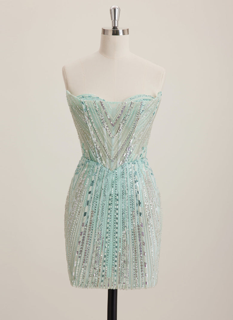 The sweetheart neckline is so flattering, and the beading and sequins make this mini dress shine from every angle. Love the sleek sheath fit!