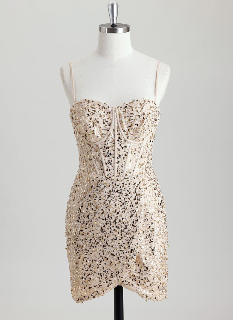This Sheath/Column Sweetheart Short Sequin Homecoming Dress features a sleek, figure-flattering silhouette with a classic sweetheart neckline. Fully embellished with sequins, it delivers a captivating shimmer that catches the light beautifully. The short length offers ease of movement, making it an elegant and confident choice for homecoming celebrations.