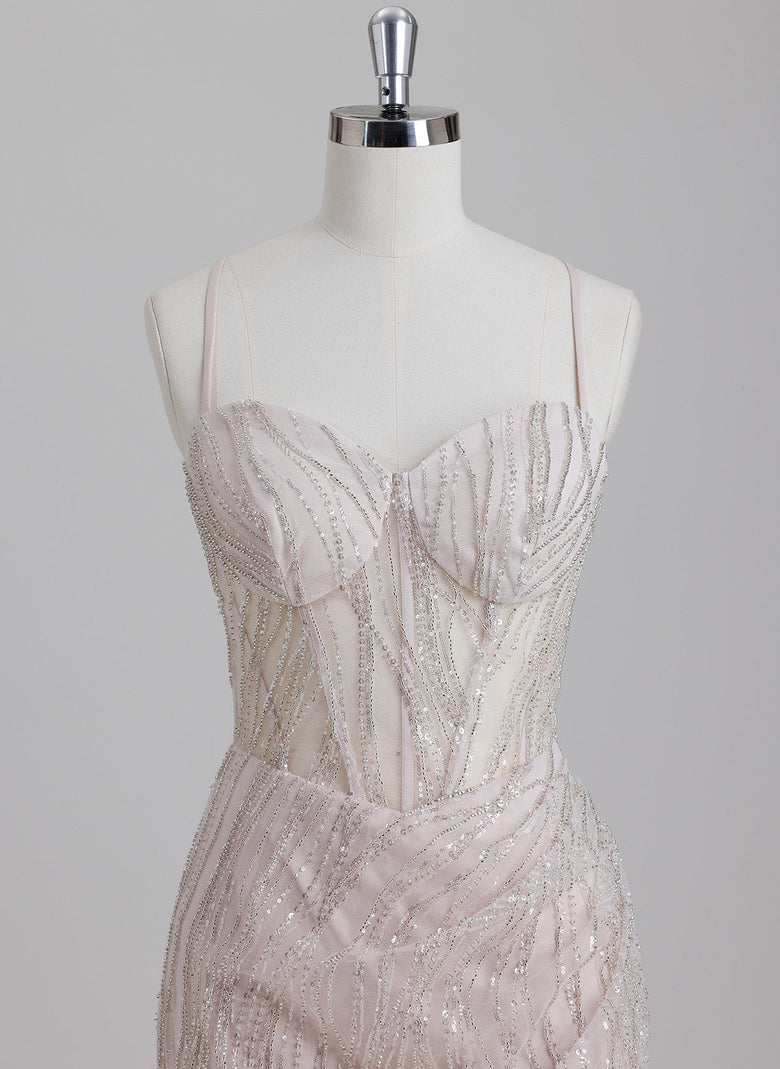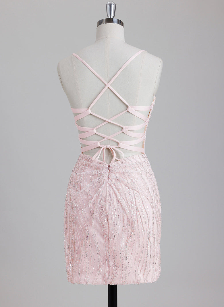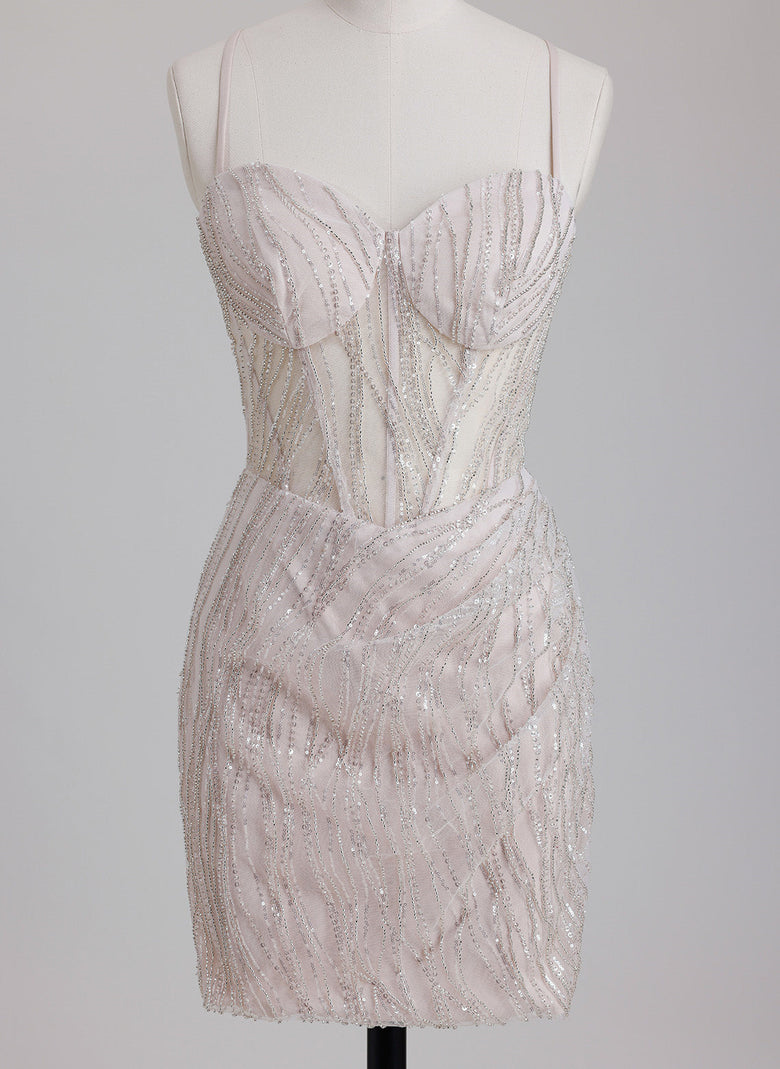 This short sheath homecoming dress features a sweetheart neckline and a sleek column silhouette. Adorned with sequins and intricate beading, it creates a dazzling, textured effect that catches the light beautifully. Designed for a flattering fit, this dress combines modern elegance with glamorous detail, perfect for making a sophisticated statement at your event.