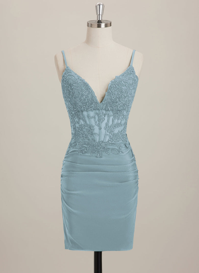 This Sheath/Column V-Neck Short Jersey Mini Dress is both chic and versatile. The stylish V-neckline and figure-flattering silhouette make it a must-have for any wardrobe. The addition of rhinestone embellishments adds a touch of glamour, perfect for any special occasion. Made with high-quality jersey fabric, this dress offers both comfort and style.