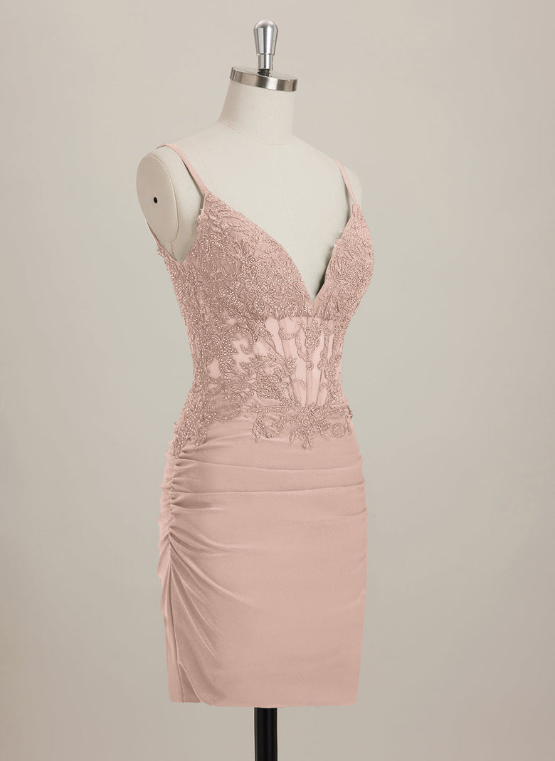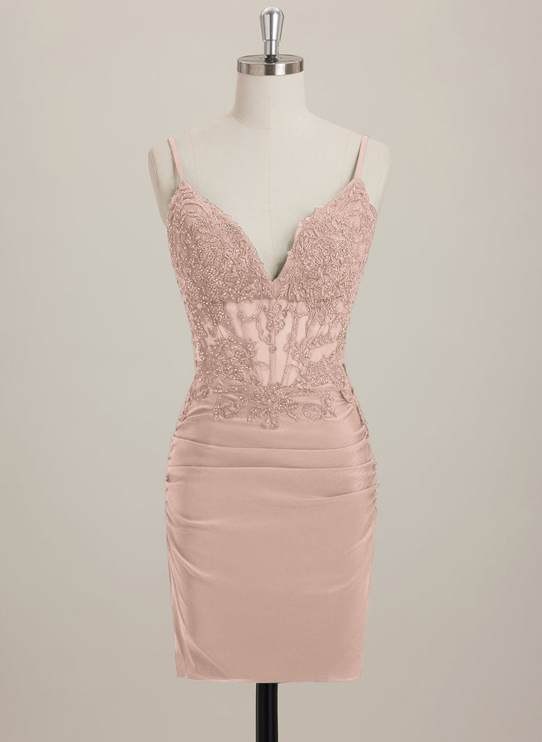 This Sheath/Column V-Neck Short Jersey Mini Dress is both chic and versatile. The stylish V-neckline and figure-flattering silhouette make it a must-have for any wardrobe. The addition of rhinestone embellishments adds a touch of glamour, perfect for any special occasion. Made with high-quality jersey fabric, this dress offers both comfort and style.
