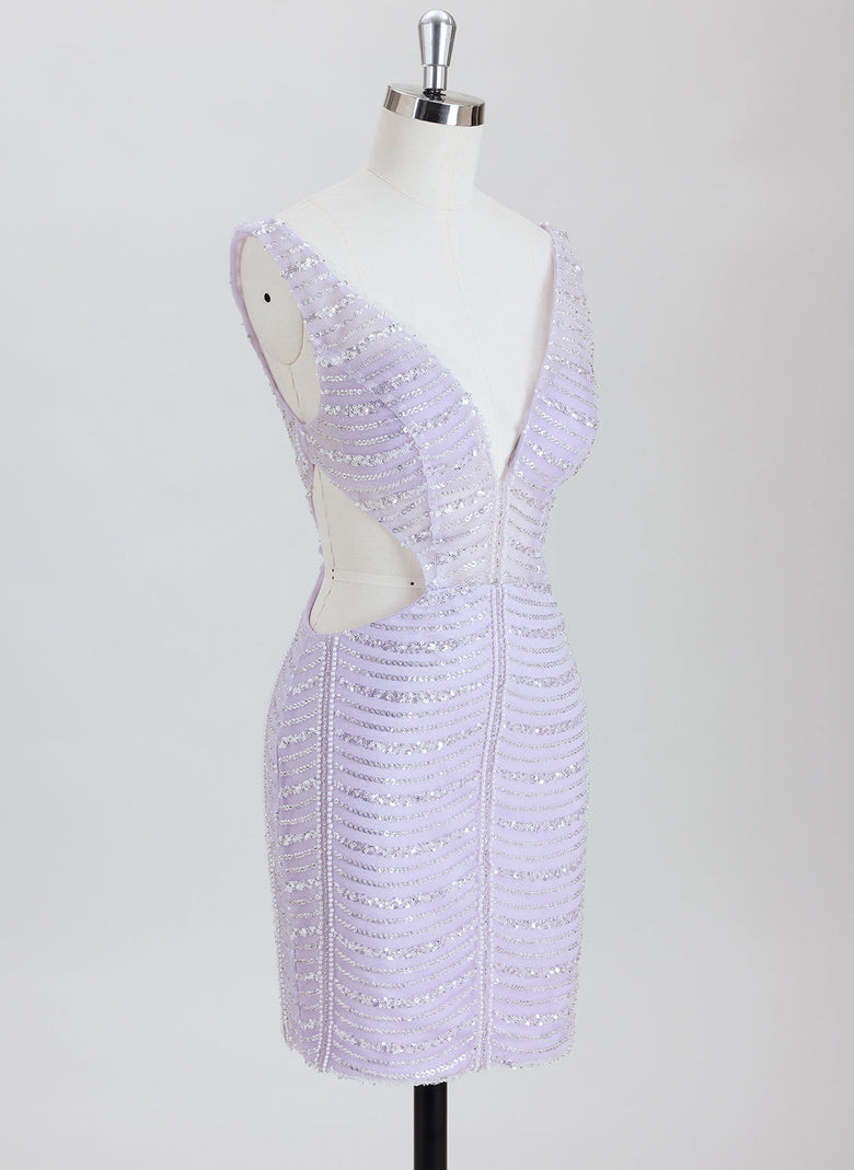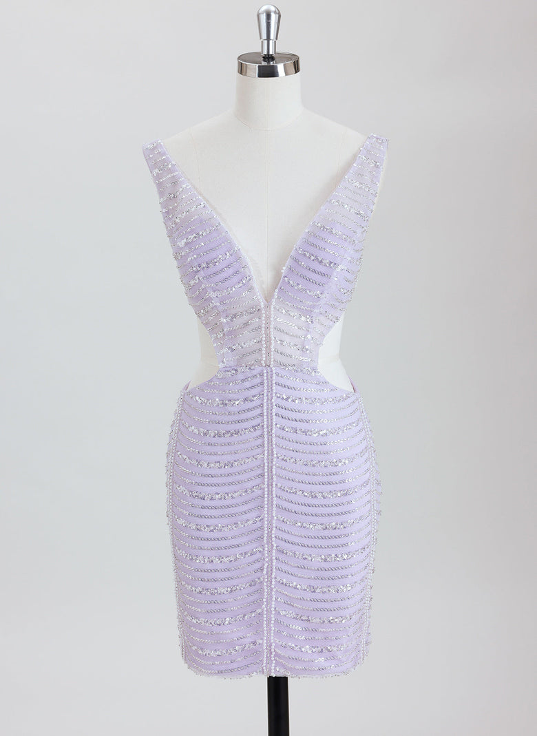 This sheath-style homecoming dress features a flattering V-neckline and a short, column silhouette that elegantly contours the body. Embellished with shimmering sequins and delicate beading, it delivers a sophisticated sparkle ideal for memorable occasions. Designed to combine style and comfort, this dress ensures a polished and graceful appearance for your special event.