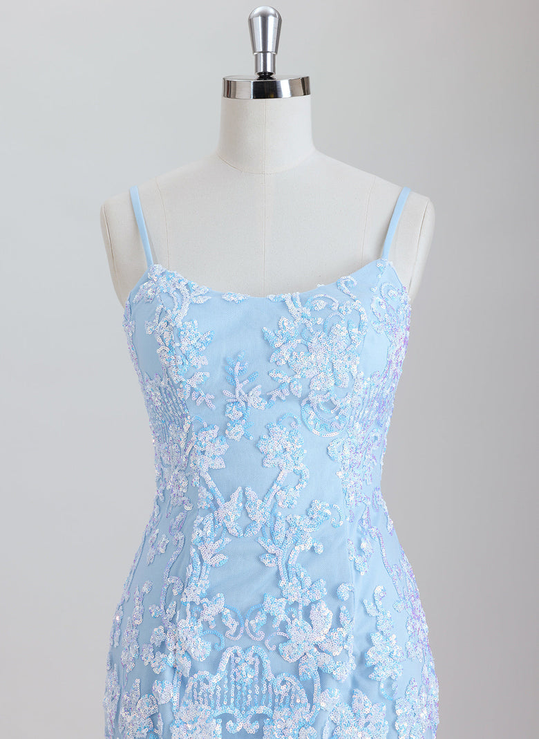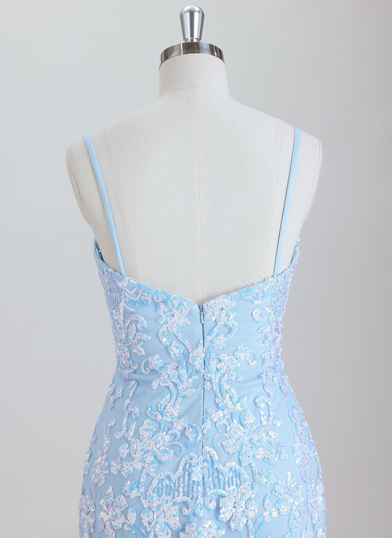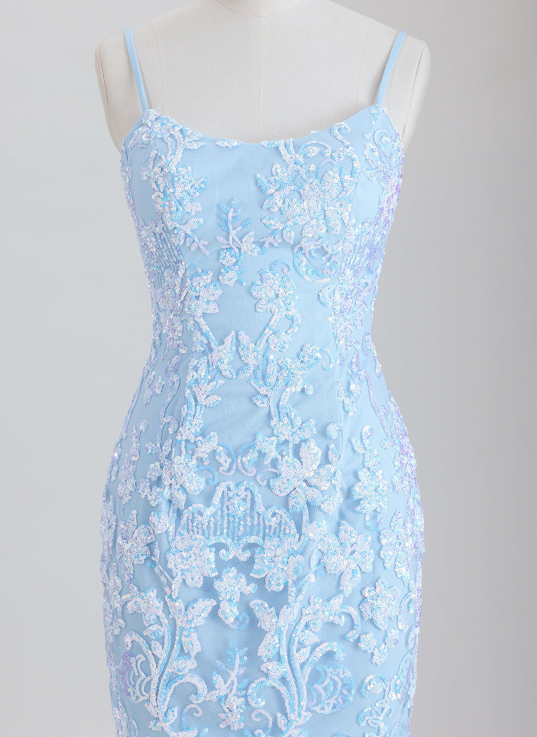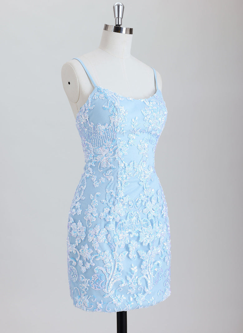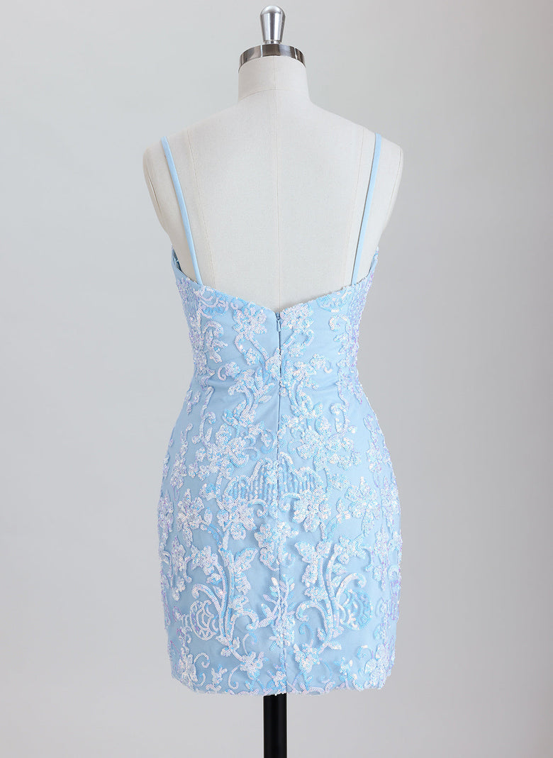 This sheath dress features delicate spaghetti straps and a short hemline, elegantly adorned with sequins for a shimmering effect. Designed for homecoming events, it offers a sleek silhouette that enhances your figure while providing comfort and style. The sequined detailing adds a touch of glamour, making it an ideal choice for memorable occasions.