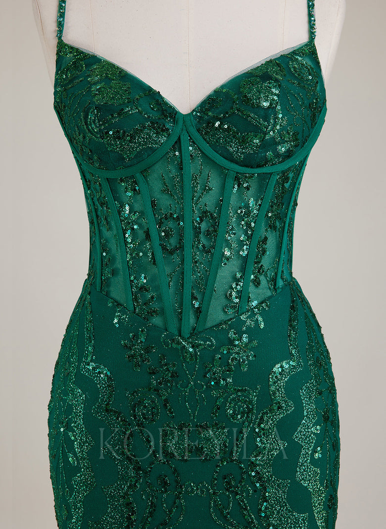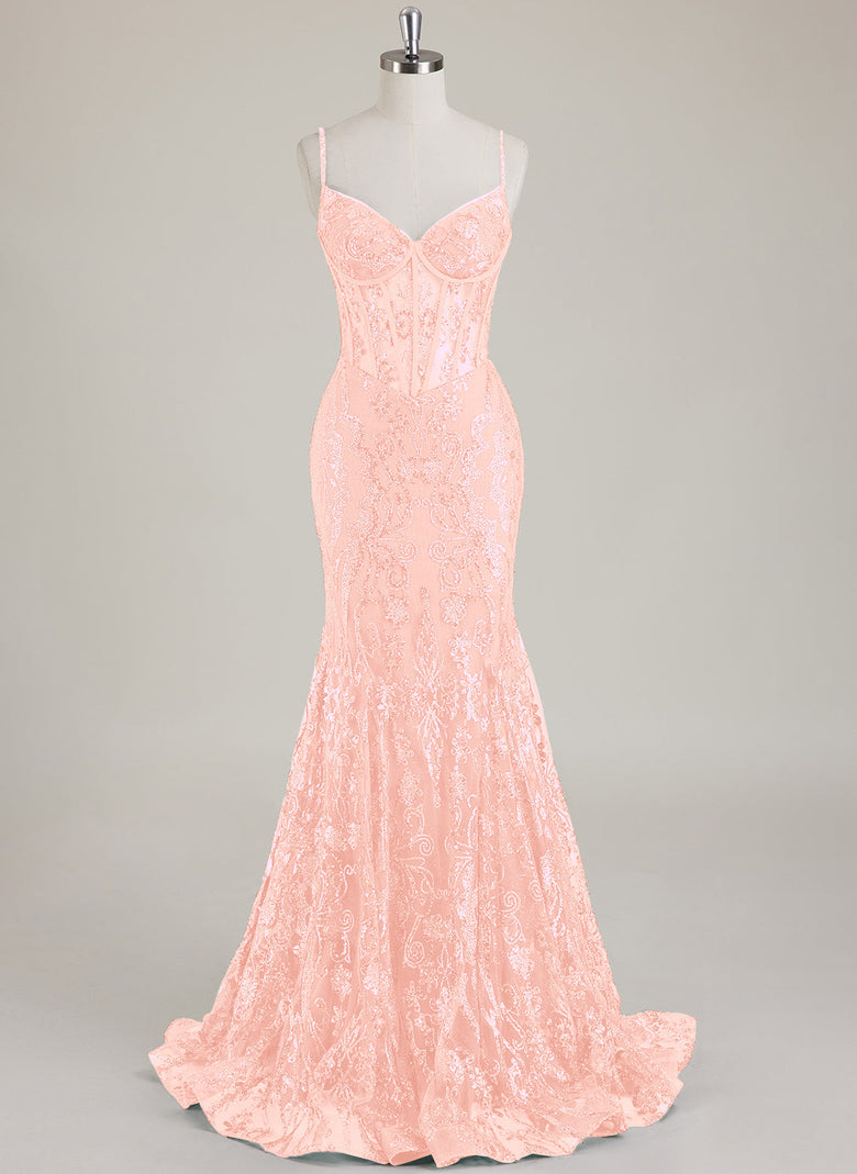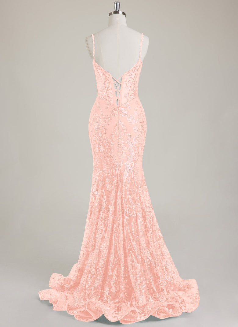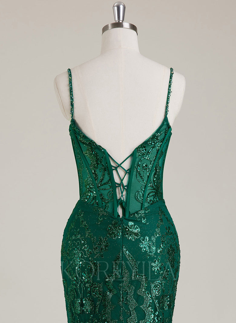 Spaghetti Straps V-Neck Corset Sequins Lace Trumpet/Mermaid Maxi Dress