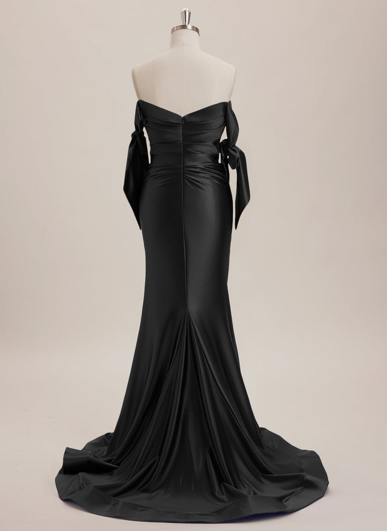 Expertly designed for a stunning look, our Trumpet/Mermaid Off the Shoulder Jersey Maxi Dress features a flattering sweep train and elegant pleated bow. Perfect for any occasion, the form-fitting silhouette and off-the-shoulder neckline exude sophistication and grace. Crafted with high-quality jersey fabric for a comfortable and luxurious feel.