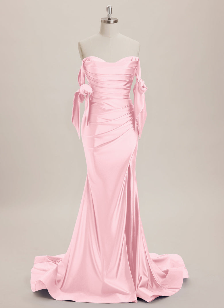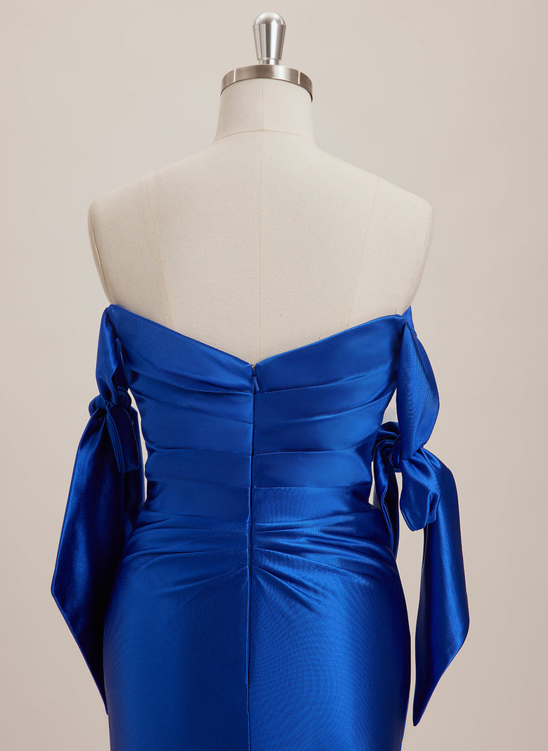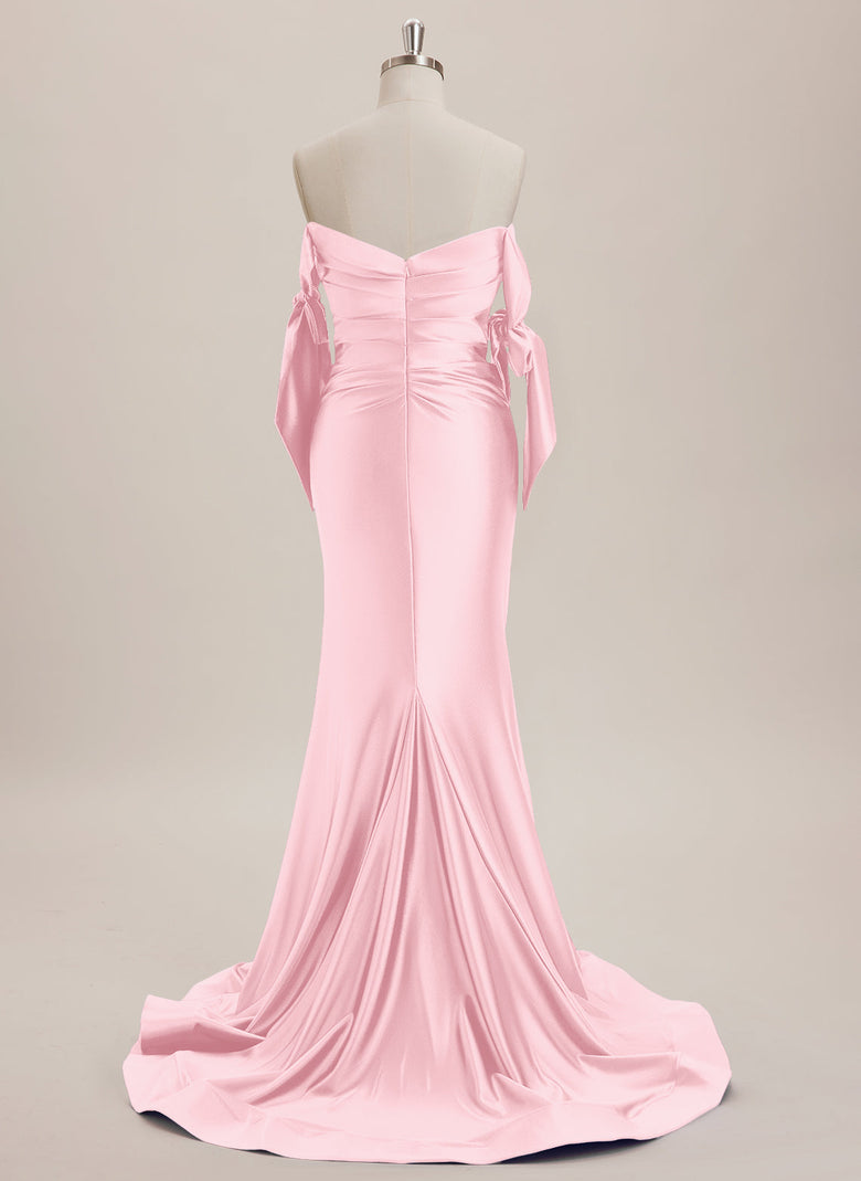 Expertly designed for a stunning look, our Trumpet/Mermaid Off the Shoulder Jersey Maxi Dress features a flattering sweep train and elegant pleated bow. Perfect for any occasion, the form-fitting silhouette and off-the-shoulder neckline exude sophistication and grace. Crafted with high-quality jersey fabric for a comfortable and luxurious feel.