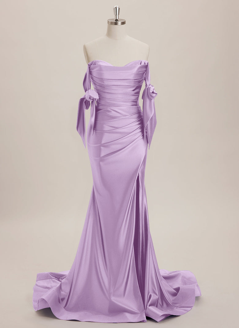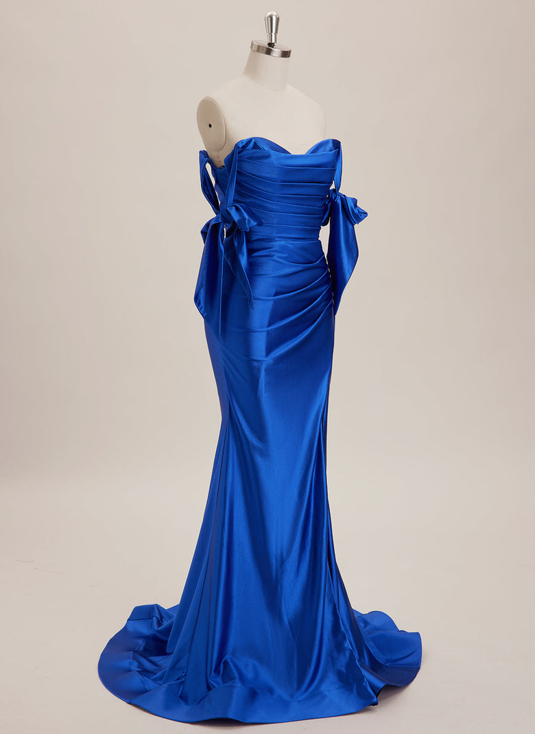 Expertly designed for a stunning look, our Trumpet/Mermaid Off the Shoulder Jersey Maxi Dress features a flattering sweep train and elegant pleated bow. Perfect for any occasion, the form-fitting silhouette and off-the-shoulder neckline exude sophistication and grace. Crafted with high-quality jersey fabric for a comfortable and luxurious feel.