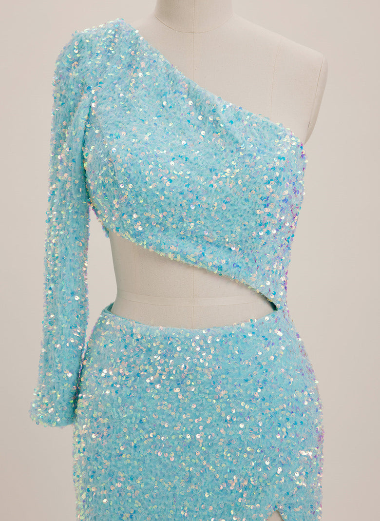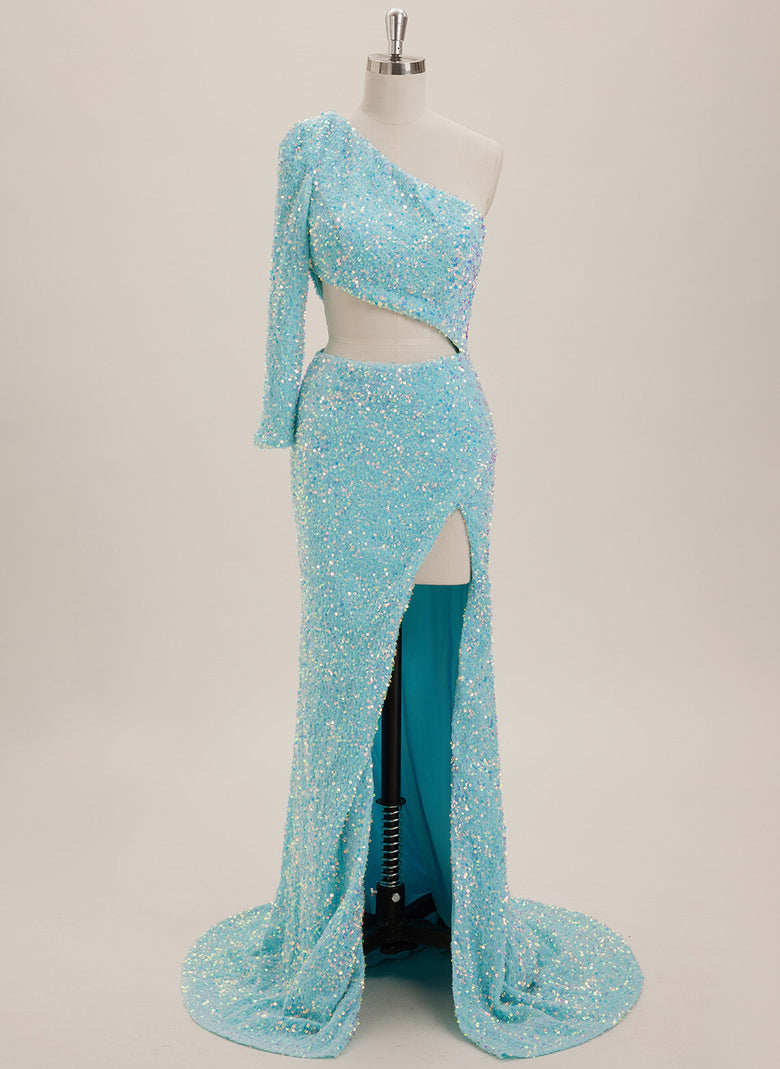 This one shoulder sequin maxi dress features a trumpet/mermaid silhouette and a sweep train for a glamorous look. The sequins add just the right amount of sparkle, making it perfect for a special occasion or formal event.
