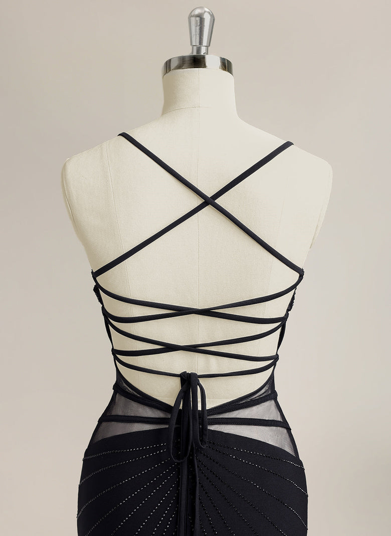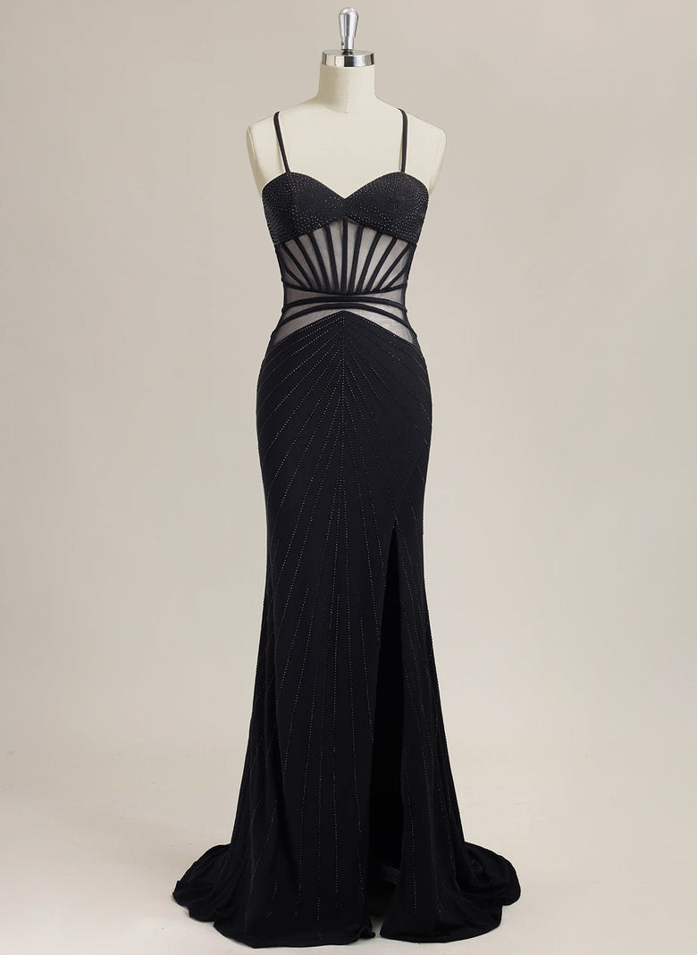 This trumpet/mermaid prom dress combines sleek jersey fabric with a flattering silhouette, featuring delicate spaghetti straps and a graceful sweep train. Rhinestones arranged in a geometric fishbone pattern add refined sparkle and visual interest, making it an exquisite choice for formal occasions.