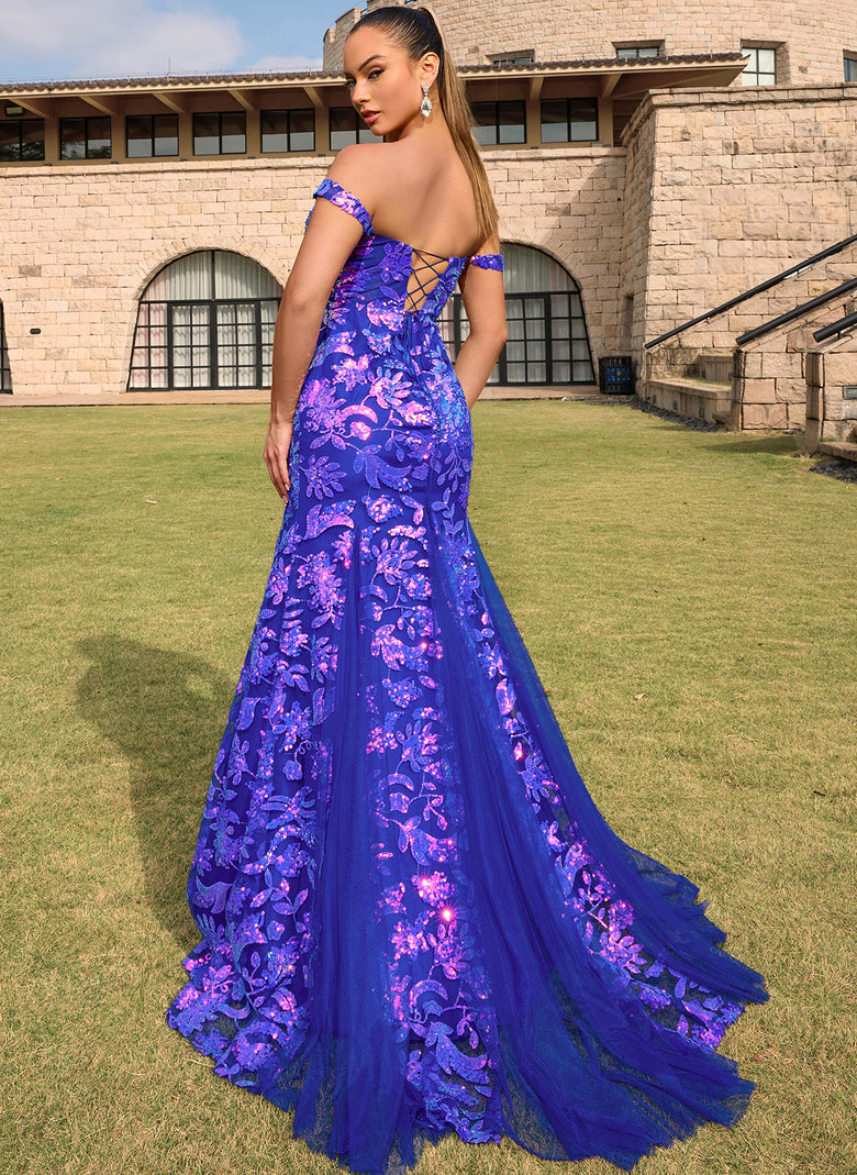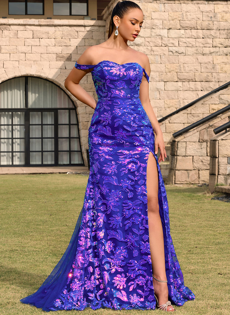 Radiate elegance in this breathtaking off-shoulder mermaid prom dress. Adorned with intricate floral appliques and shimmering details, this gown highlights your curves with its fitted silhouette. The dramatic thigh-high slit adds a bold touch, while the lace-up back ensures a perfect fit. Complete with a sweeping train, it's the ultimate choice for a night of glamour and sophistication.