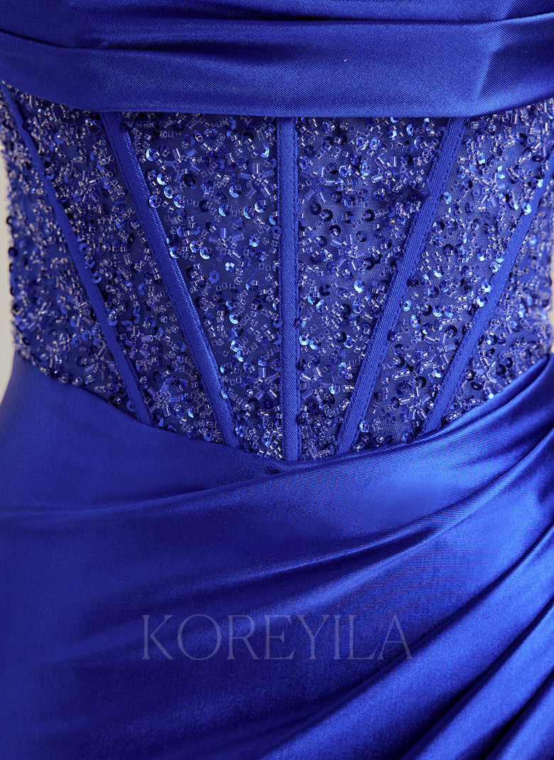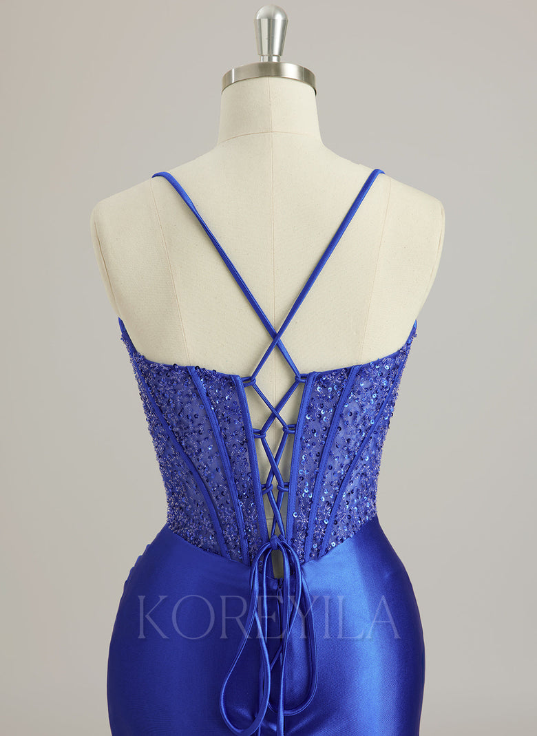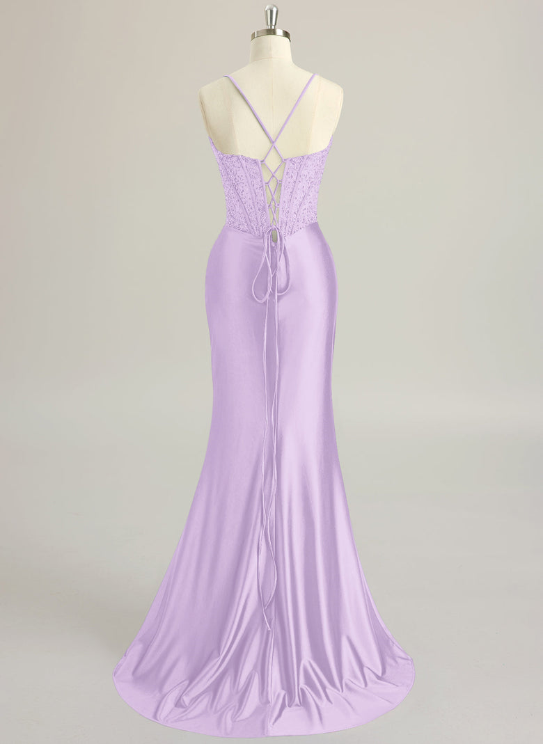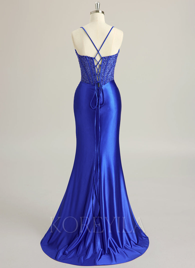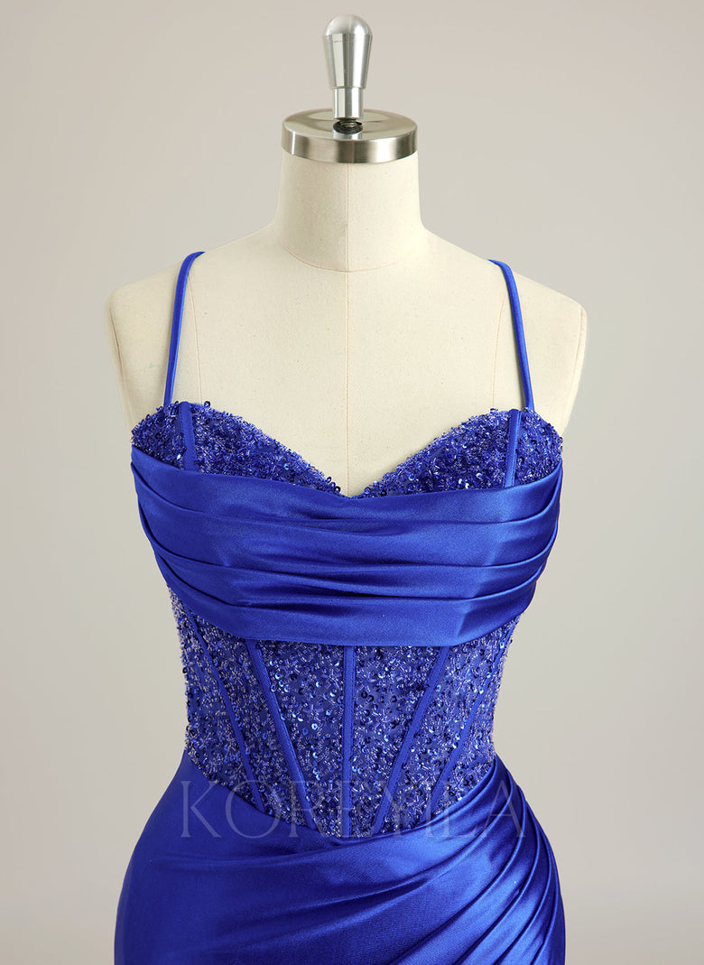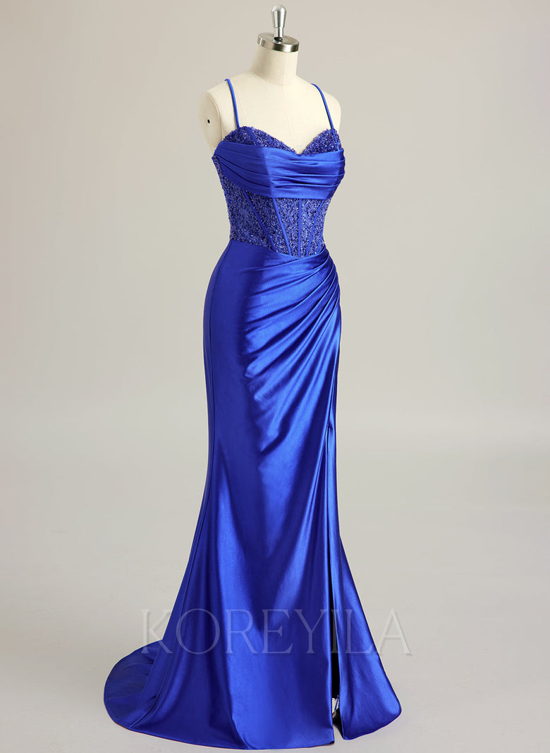 Spaghetti Straps Sweetheart Elegant Sexy Sparkle & Shine Vintage Beautiful Back Beading Pleated Sequins Silky Satin Trumpet/Mermaid Maxi Dress With Leg Slit