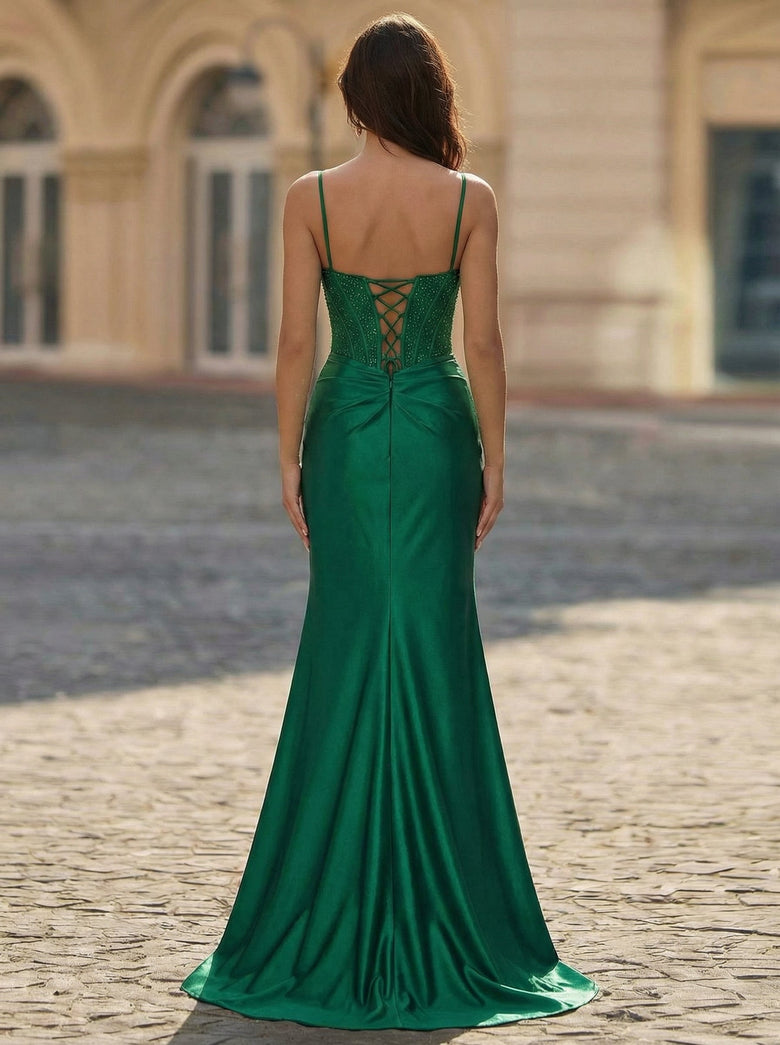 Spaghetti Straps V-Neck Sexy Sparkle & Shine Vintage Beautiful Back Corset Modest Prom Dresses Beading Rhinestone Sequins Silky Satin Trumpet/Mermaid Maxi Dress With Leg Slit