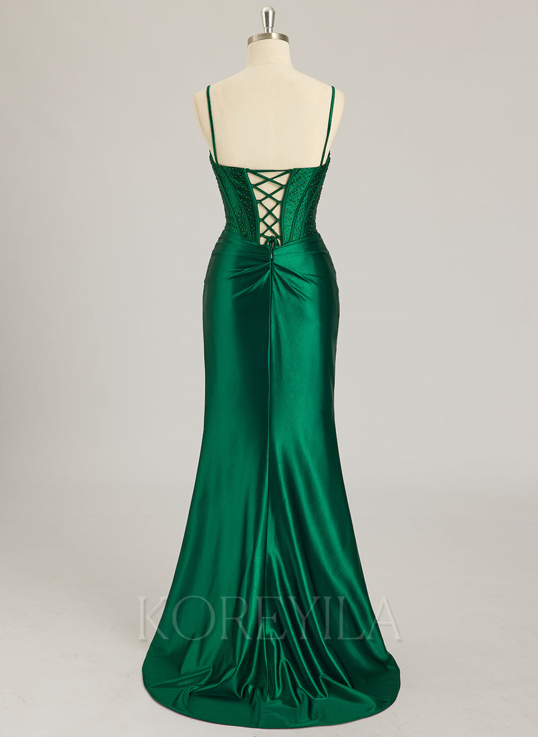 Spaghetti Straps V-Neck Sexy Sparkle & Shine Vintage Beautiful Back Corset Modest Prom Dresses Beading Rhinestone Sequins Silky Satin Trumpet/Mermaid Maxi Dress With Leg Slit