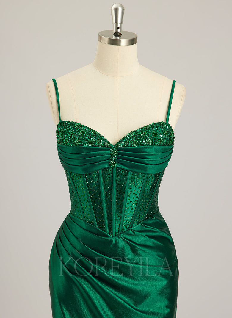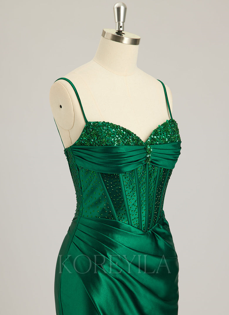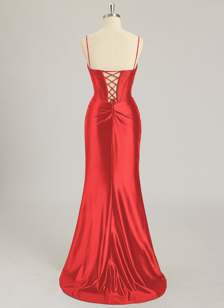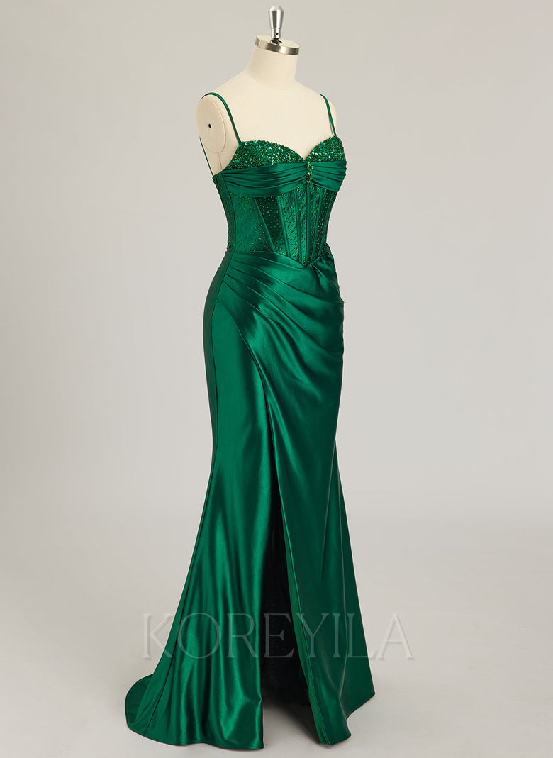 Spaghetti Straps V-Neck Sexy Sparkle & Shine Vintage Beautiful Back Corset Modest Prom Dresses Beading Rhinestone Sequins Silky Satin Trumpet/Mermaid Maxi Dress With Leg Slit